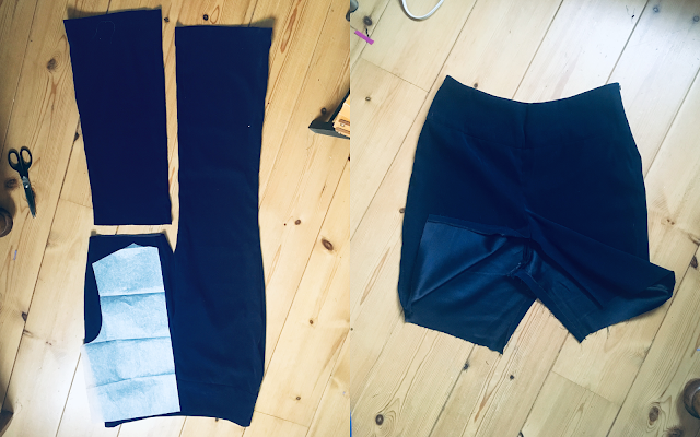The idea of this refashion can be executed with all sorts of pants. It'll really work nice with jeans (a future project!). An important first step is deciding the length of the (future) jacket. Take a pattern to get an idea of the back length. As you can see the waistband will also be the waistband of the jacket, but turned upside down. After I cut off the legsi, I opened the inner seam.